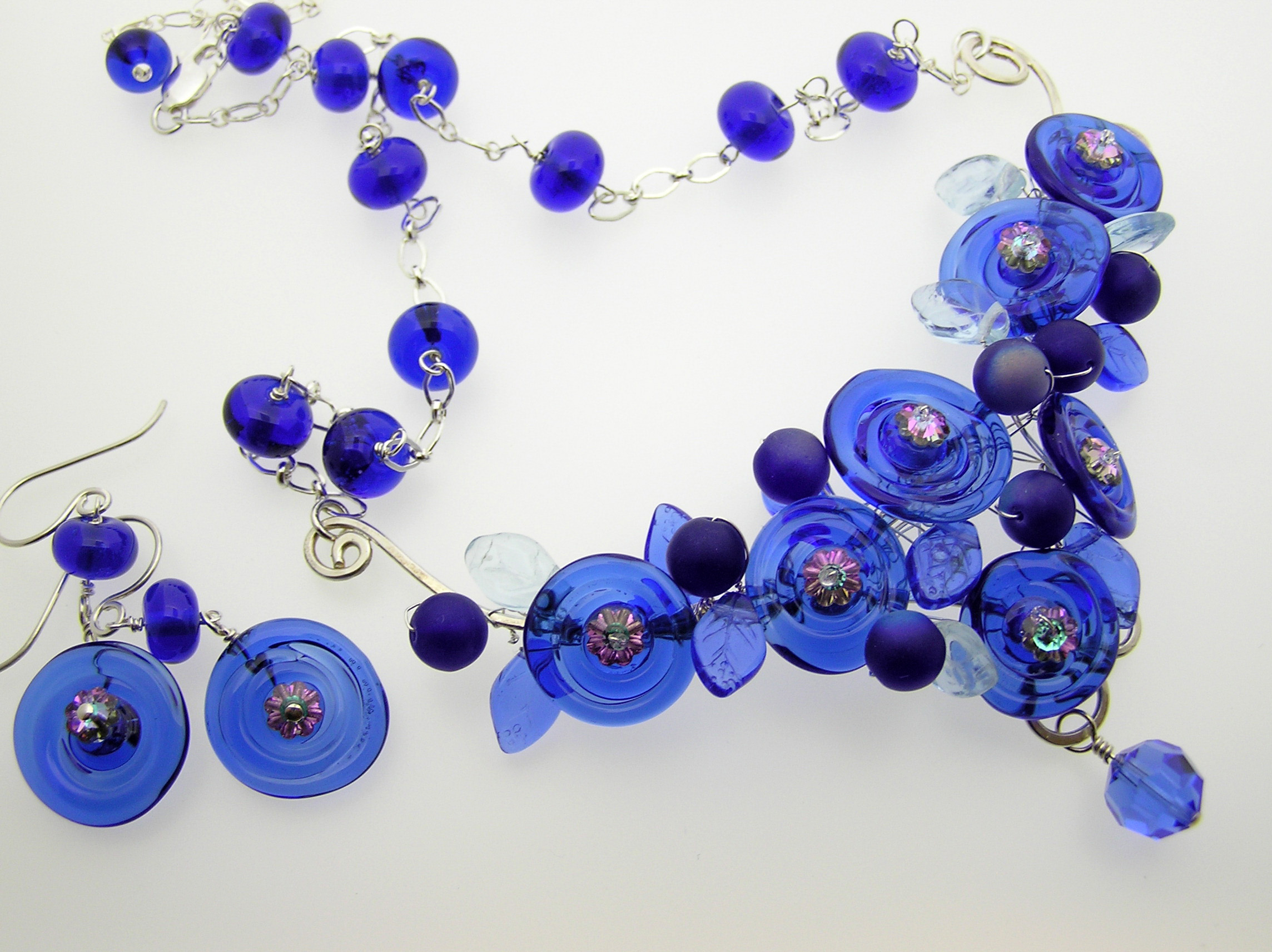 I recently entered a recycled art contest on a whim. To my pleasant surprise, I won 1st place! The recycled object was a beautiful blue glass bottle containing an energy drink. I made disks and small spacers and put together a necklace/earring set. Breaking the glass down to manageable pieces was a challenge, but the overall process was a lot of fun. I named the set “Something Blue” – I am very honored.