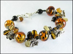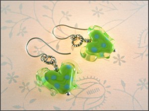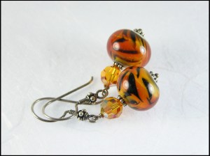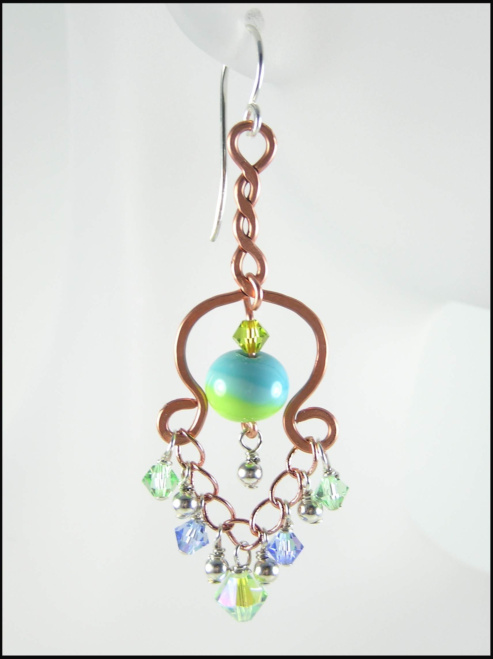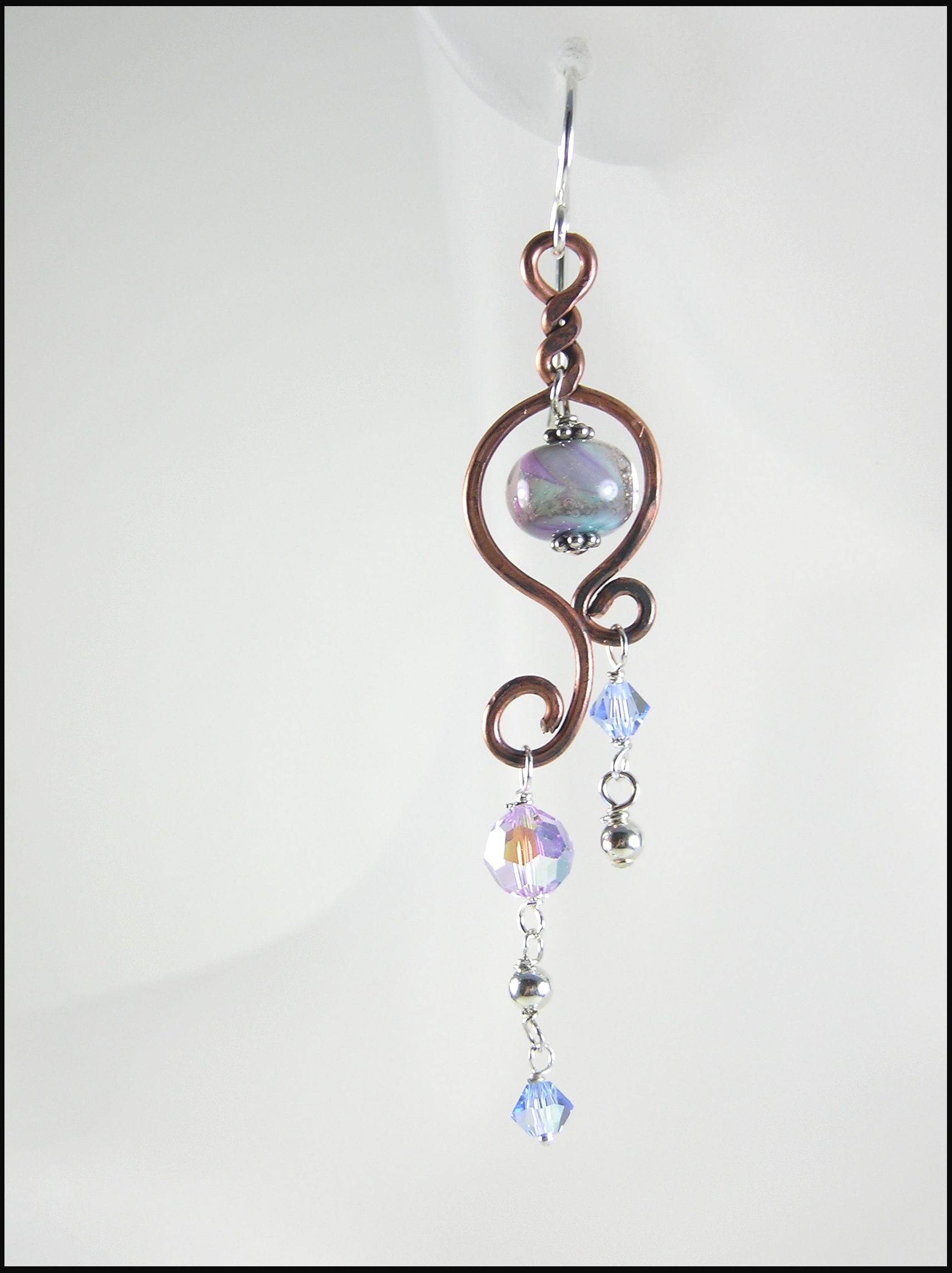 I was inspired by the Sep/Oct/Nov Belle Armoire Jewelry Magazine to make these earrings. I incorporated tiny lampwork beads I made – didn’t they come out beautifully! It was fun working on them as copper is not my usual medium. I put a patina on the one to the right: