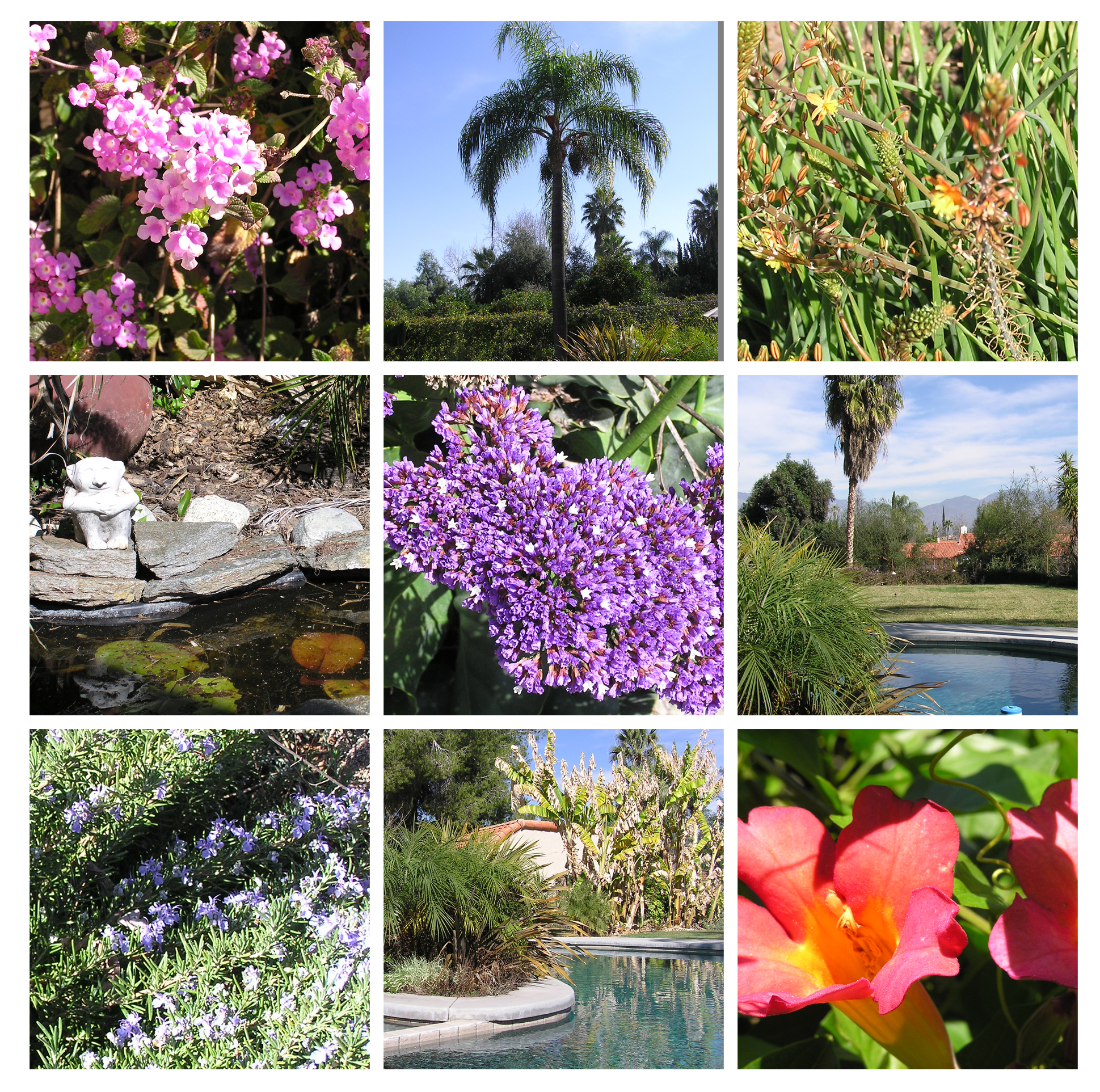 And here are photos from my back garden. The local mountains are still snow capped. After some difficulty last summer, the lavenders are looking really good now. We had a few days of cold weather and the banana trees suffered. It’s nothing compared to what the rest of the country is experiencing, but for California standards, it was cold. I do a fair amount of planting, but more often than not, after I plant something, I forget their names. I’m afraid I’m not a very conscientious gardener. My dogs love to eat the fruits that fall from the Queen palm – they leave the pits scattered all over the patio. And here is our garden gnome “Harold” presiding over our little pond. His brother “George” presides over the vegetable garden, but I didn’t take a picture since the vegetable garden is a real mess right now :-). I had planned to make it a year round vegetable garden, but it didn’t happen this past season… maybe this season?