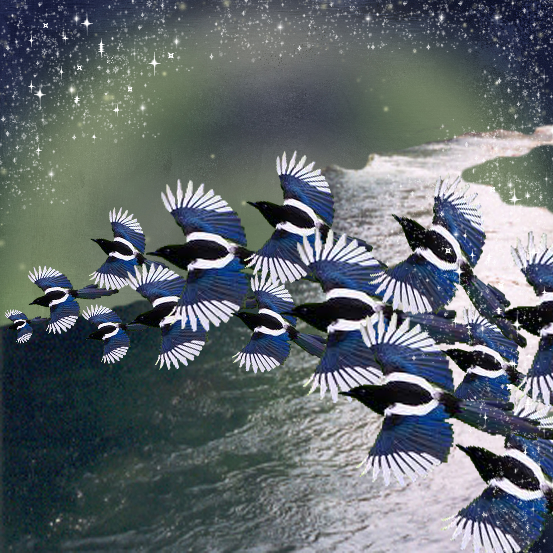When I was a child, there was a story that went with the Tanabata Festival about two lovers who were only allowed to come together once a year.  The girl was the daughter of the sky king, and the boy a farmer. A great river separated the two, and on the 7th day of the 7th month, a boatman (the moon) would ferry them across to meet. If it rained,  magpies would come together to form a bridge over which the two lovers could cross and meet.  If you are interested, you can go to Tanabata for more on the festival and story.