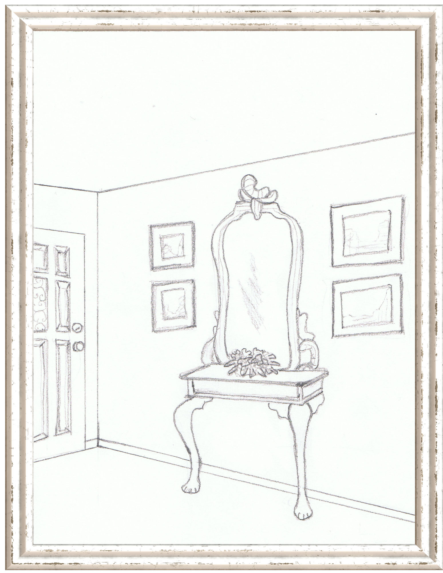 To put it nicely, our home decor would be “eclectic”, except for the foyer. DH’s grandfather was an antiques dealer in Rome. He grew up amongst real European antiques, and now has a slight aversion to it. So, when we got back to the States, and I happened on this mirror/console in an antique store, I loved it, but wasn’t sure he would like it. I took him to see it, and he replied “if it sings to you, get it”. So, I did, and it now graces our foyer. It is flanked by four Canaletto prints that belonged to his grandfather (I did not attempt to sketch those).