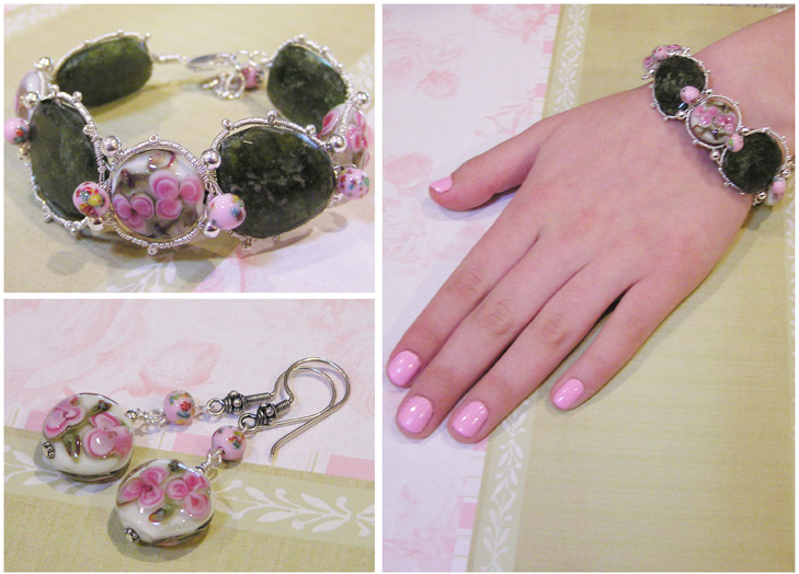 Now I remember why I had not made a wire wrapped bracelet in some time. Although very pretty, the process is very time consuming. I decided to use some lentil shaped lampwork beads I made along with some Vessonite stones and vintage beads I had: