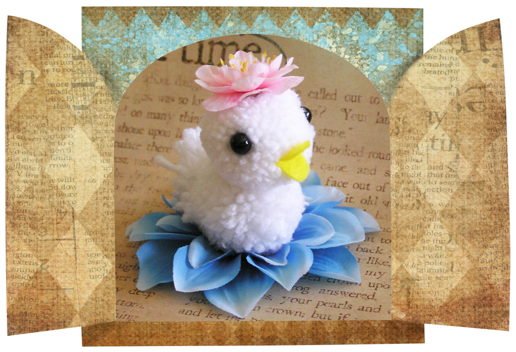 My daughter happened to have some white yarn so I went from there. I figured chicken chicks are yellow, so I ended up making more of a duck bill. Then I was too lazy to make legs, so I sat her on some flower petals I had from another project. And “voila”, a cute generic birdie chick :-).
