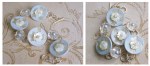I combined some contemporary buttons with some vintage glass ones and added swarovski crystals & pearls. The main buttons are a very pretty soft blue with recessed ivory flowers. This is really one of the very first bracelets that I made that have glued on components – I hope the E-6000 glue has staying power…