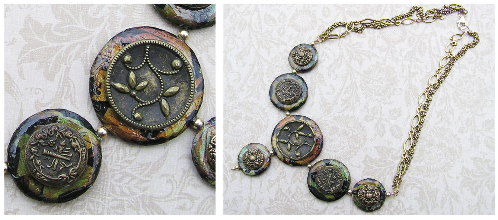 I wanted to frame the buttons to enhance their beauty. So I decided to use donut beads. Well, I have several stone donuts, but they weren’t the right size, and even then, I would have had to glue the buttons on or quite possibly cut the shanks. I didn’t want to do either, so I made my own donuts. Since, I had paper clay around from my Izannah Walker doll ( yes, I am still working on that), I fashioned the beads from that. After sculpting, applying gesso, painting, and collaging, I had what I wanted. The collage is actually an Egyptian motif – it’s so small it can’t be seen. Anyway, the process was fun and I like the results :-).