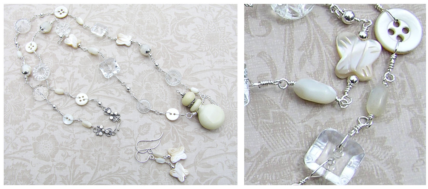 I had so much fun making a vessel for the German Bead Babes Go Challenge, I made another one. This time, I used Bullseye opaque glass to match the pretty mother of pearl buttons & beads. I added a few of my vintage clear glass buttons as accents. There was even enough to make a pretty matching earring set.