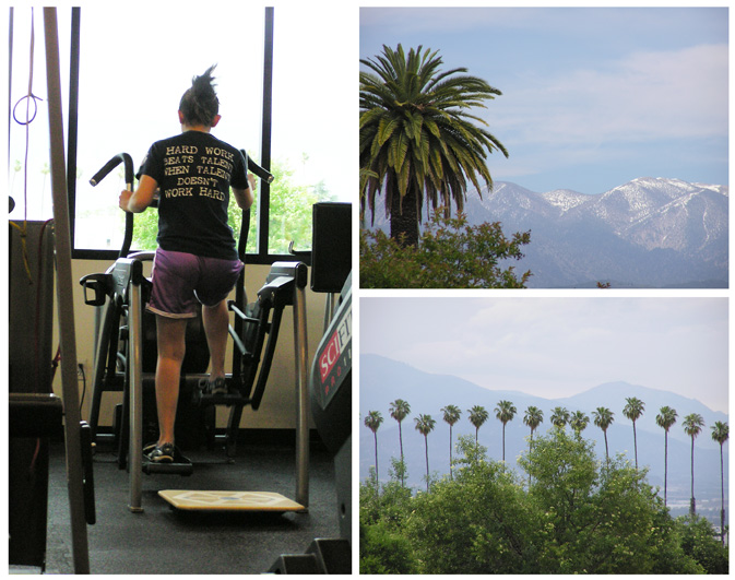 I did this during my daughter’s physical therapy. Since I had my camera (to take the “before” tangle), I took some shots of my daughter working hard. At least she has a nice view out the window :-). This is the quintessential image of what surrounds our town; Orange groves set amidst rows of palm trees against a backdrop of snowcapped mountains. Ok, there are some random trees that got in the way of the orange trees, but they are there :-):