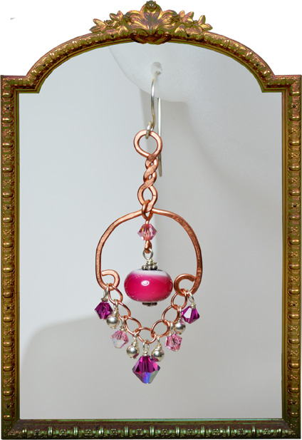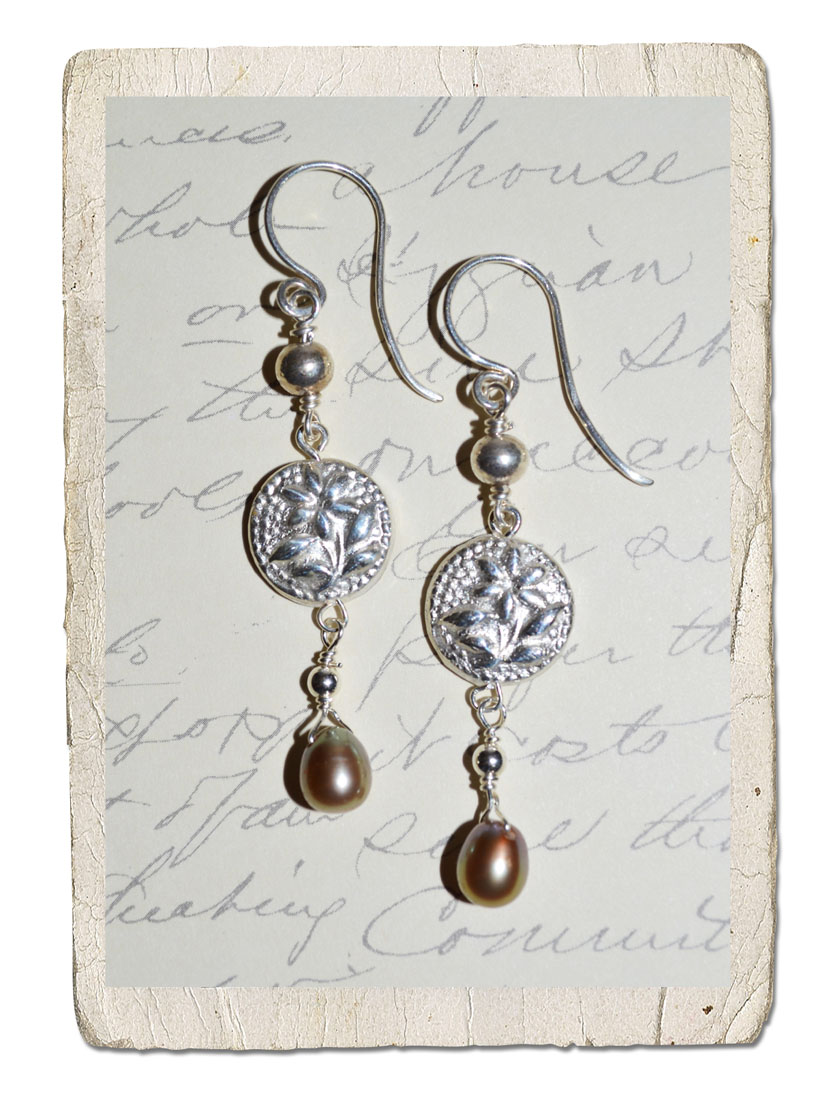 It’s been a while since I made anything with silver clay. So, here are some earrings. I used a mold I made from vintage glass buttons, pressed the clay, fired, polished, and combined it with bali sterling beads and champagne freshwater pearl drops: