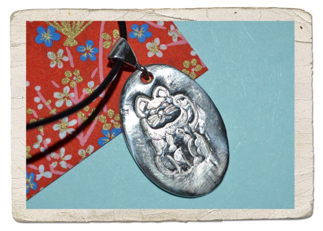 And here is a pendant I made. It is decorated with a “Maneki-neko”, beckoning cat. In Japan, Maneki-nekos are a symbol that beckons or welcomes good luck and fortune:
