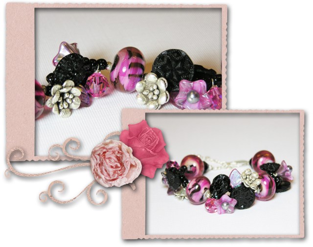 I made the usual animal print core, encased it in clear and finished off with one of my favorite glass – rubino oro. The bracelet also has vintage jet glass buttons as well as Thai sterling silver flowers, Czech pressed glass, fresh water pearls, and swarovski crystals. You can find it in my Etsy Shop.