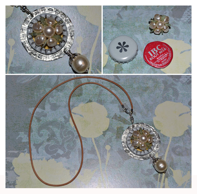 I pounded one bottle cap flat and drilled holes. The other, I took pliers and smashed inward. Then I rummaged through my vintage stash, and found a perfect old pearl clip earring. I also added a vintage costume pearl drop with sterling components, hung it on a tan leather cord, and “voila” – a pretty pendant! It almost has a steampunk feel to it :-).