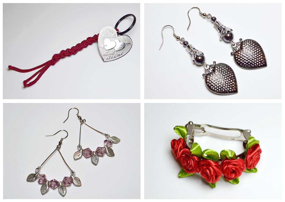 It’s amazing how we retain things we learned in childhood – I made the red cords into a keychain by using the macrame techniques that I learned long long ago. I also used hematite beads to make heart earrings. The swarovski crystals were made into dangle earrings, and the red ribbon roses (unique to my kit) were made into a hair barette. Now, I just loved the pink pearlized vintage glass cabochon, so I got some Vintaj brass components and made it into a necklace: