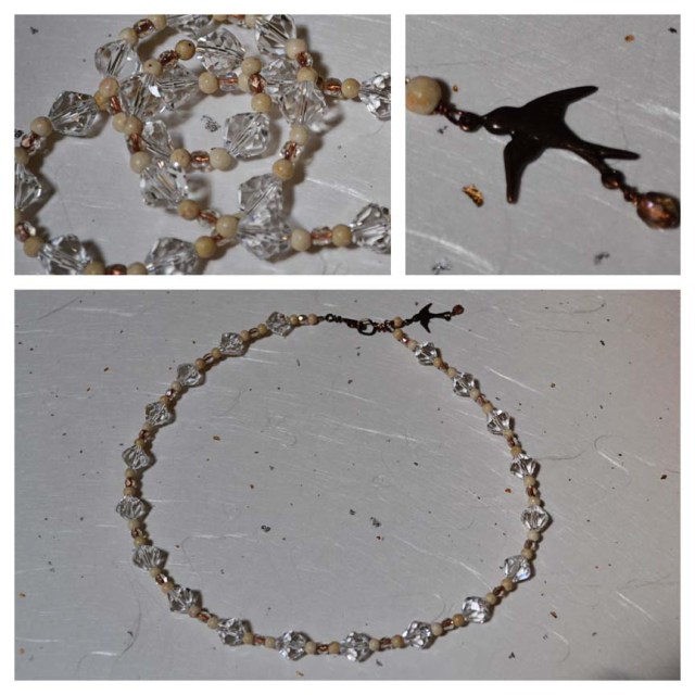 For this necklace, I used the delicate off white stone (bone?) beads, brass bird charm, and handmade brass clasp from Tracey. I complemented them with cut glass beads, and Czech polished glass beads to achieve a more vintage feel. I really like the bird charm on the back of the necklace: