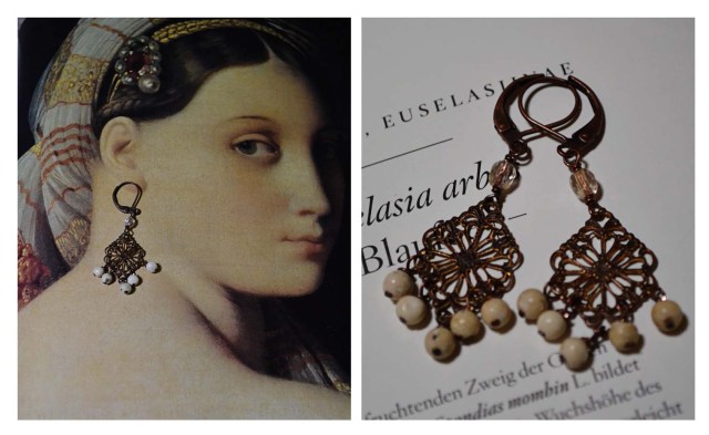 I used what remained of the white stone beads, combined them with Vintaj brass components, and finished them with copper lever back ear wires to make these earrings: