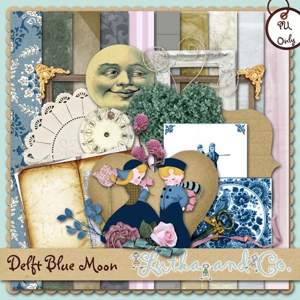 When I saw this photo, I thought of all the pretty blues, and Delft Blue came to mind. Delft holds a special place in my heart, as the city that my DH and I met in grad school. The year we were there, they even had a blue moon! Thus, the name Delft Blue Moon :-). I scanned and extracted tiles I had gotten back then. I also found a vintage embroidery pattern of a little Dutch boy and girl that I colored digitally. And here it is: