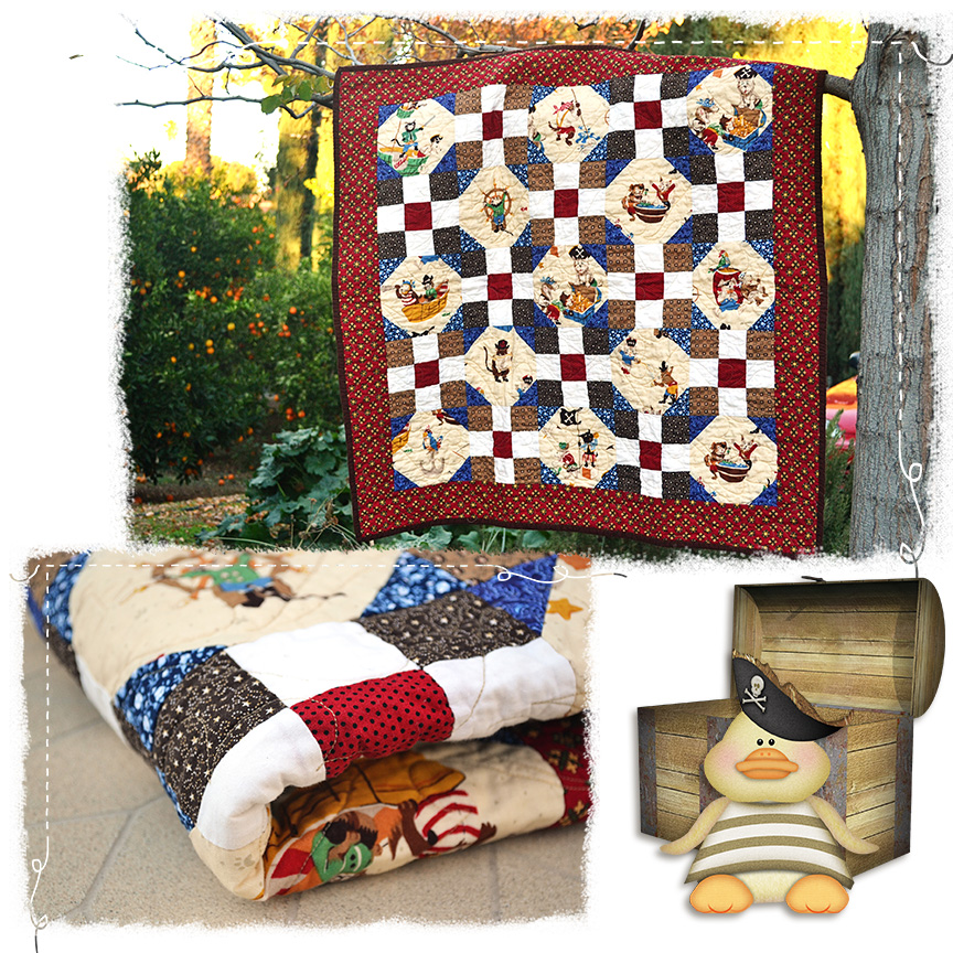 I was asked to have a small quilt ready, no larger than 40″ x 40″. So, I opted to do a baby quilt. I love novelty children’s fabrics, so I pulled out some Pirate fabric, some coordinating scraps, and made a baby Pirate quilt. As I don’t have a baby in my life currently, I think I will put it aside for future grandchildren 🙂