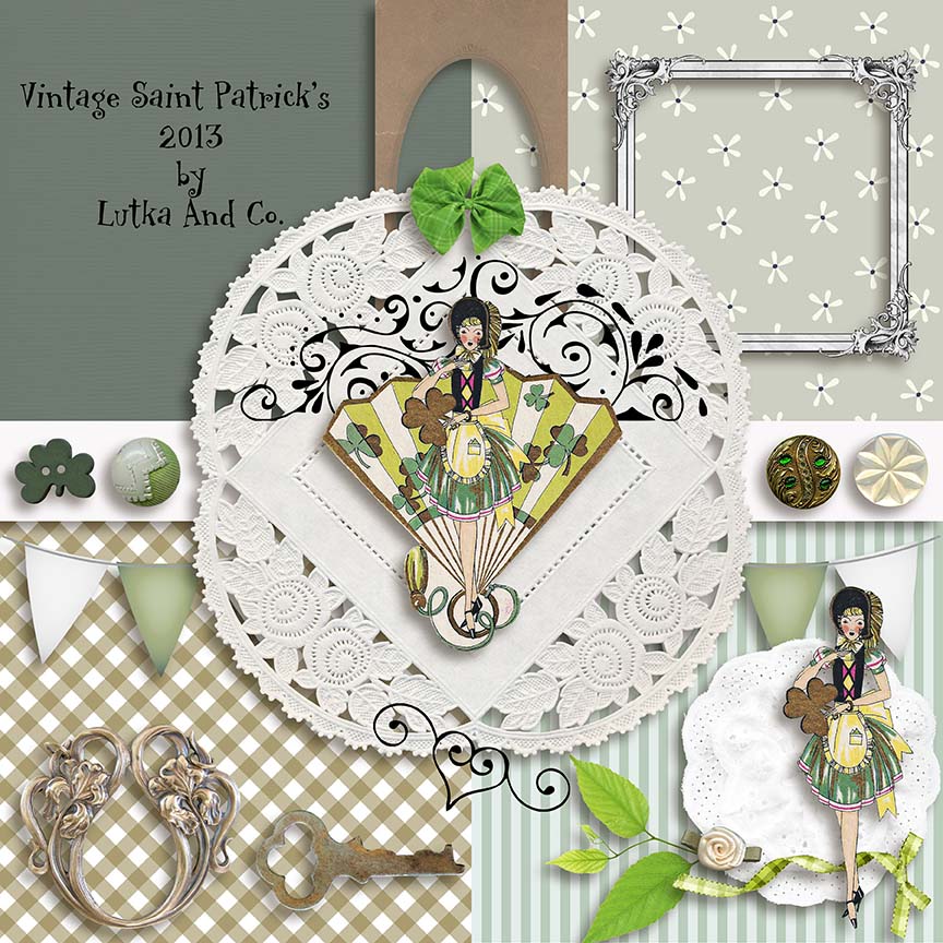 I recently purchased a very pretty vintage art deco die cut bridge tally card. Oh, I just love vintage! And, since it was so nice, and perfect for Saint Patrick’s Day, I decided it was time to put together a quick mini kit. I scanned, cleaned up, and extracted this pretty girl on a fan holding a clover, added some CU stuff, and here it is. Please note, it is for personal use only: