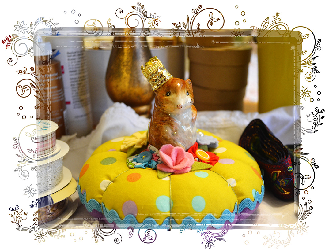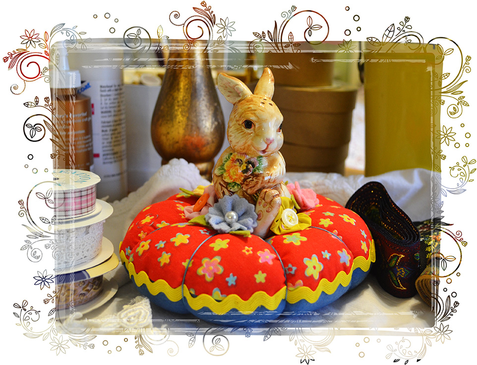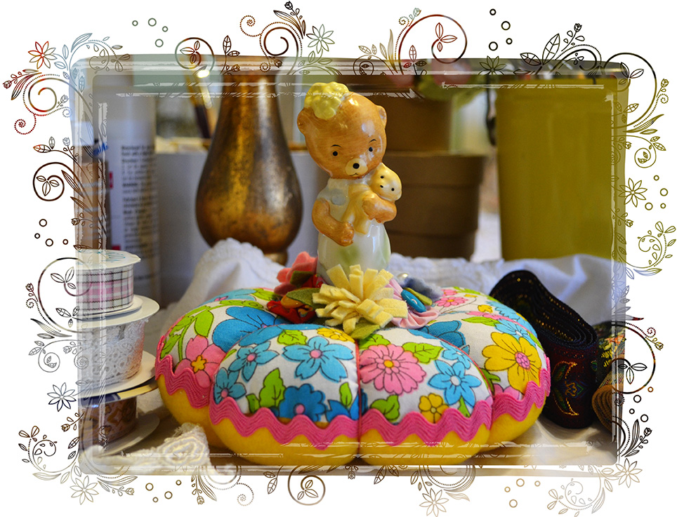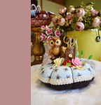 Now that I am in a creative mood, I need to make sure that I actually get to the “creating” part. I have a tendency to get an idea for a project, gather the materials, then move on to the next idea in my head before implementing and completing my first project. With this in mind, I sat myself down at my desk and finished DD’s pinkeep. Since she will be off to College in the fall, I added a few more things. I used a vintage Josef owl toothpick holder to hold the little scissors, and thread. I also added a little button for a needle station. I think it came out pretty cute: