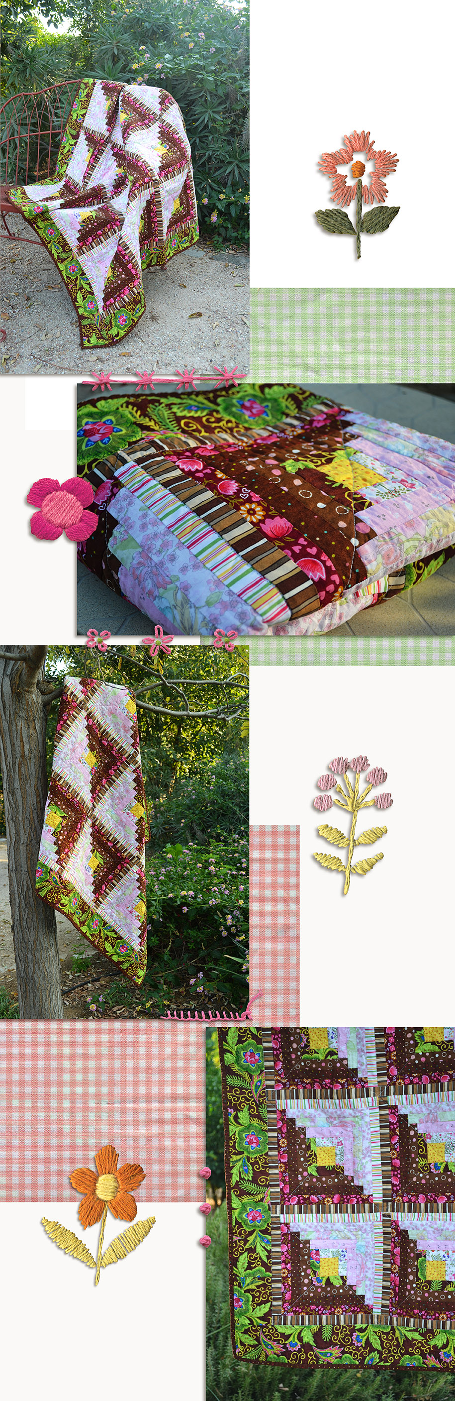 Well, I have finally finished my first quilt! (first since I took up quilting again).  This one is for my mother-in-law.  She favors earth tones, so I combined my love of pink, and her browns to make this log cabin quilt.  My friend Ellie helped me pick out the fabrics.  Piecing was a cinch, but then it sat on my table for weeks, until I got the determination to finish it.  Stitching in the ditch went pretty smoothly, then I decided to do some free motion on the borders… Practicing free motion on a 12″ x 12″ sandwich is very different from quilting a whole quilt.  Let’s just say, once I got started, there was no going back.  The thought of taking out all those stitches was not so exciting, so I just sallied forth and it was “everything goes” free motion.  In the process, my 16 year old Singer started giving me trouble… Perhaps, a new machine is on the horizon?