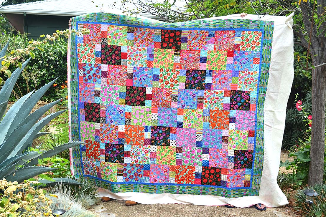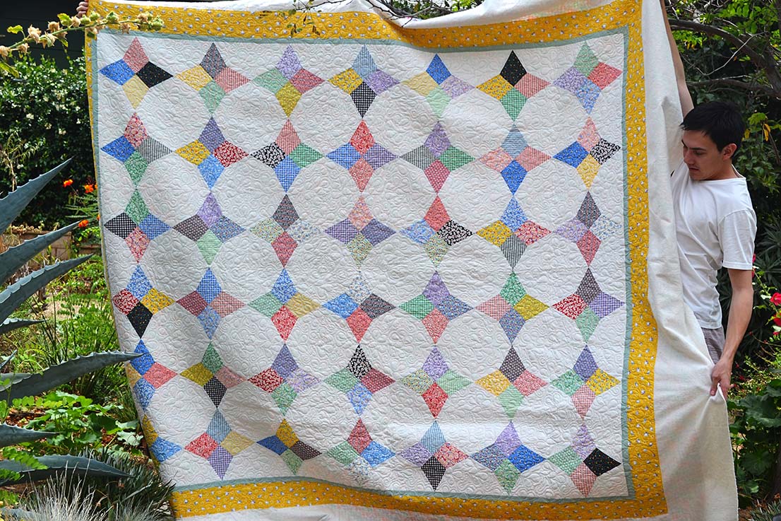 Finally, I have made quilts for myself! They still need binding, but I decided to enlist the help of dear hubby and younger son (before he takes off) to hold up the quilts. The first one is a 30’s style, and the second one is a Kaffe Fasset. They are both queen size, and therefore held sideways: