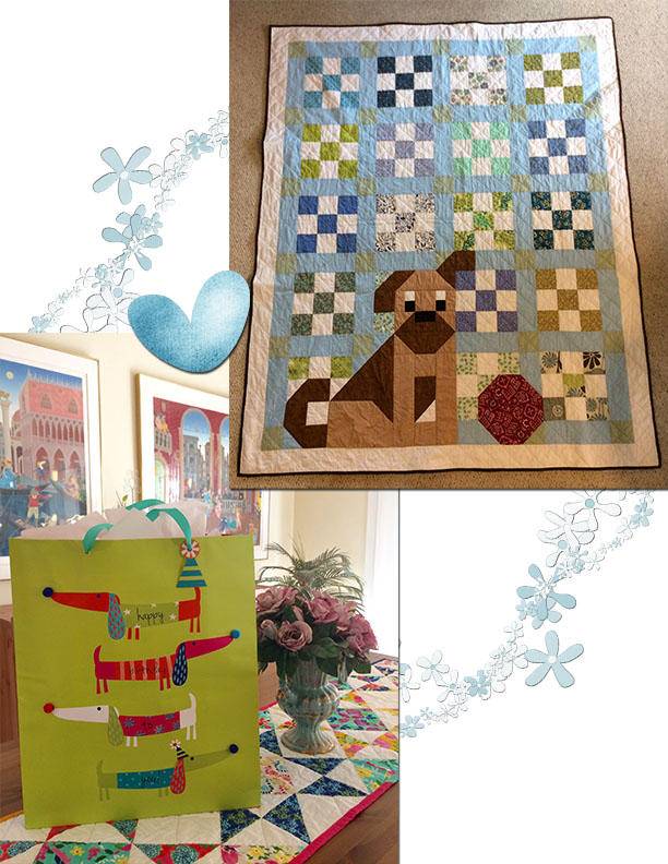 When we go out of town, I have a friend who takes care of our dogs. She is a super dog lover, and takes such good care of our dogs that I wanted to make her a quilt. I saw this on Pinterest, and thought it would be perfect for her. In lieu of batting, I sandwiched flannel, and backed it with fleece. I love the feel of this combination. And here in So Cal, a lighter quilt can be used year round. It isn’t her B-day, but I liked the dogs on the bag, and the quilt fit just right 🙂