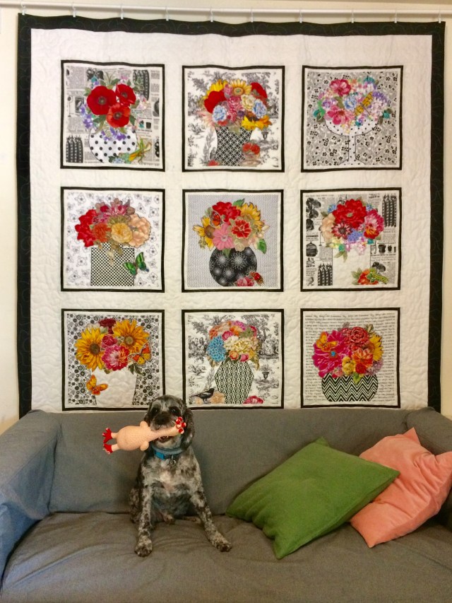 I have a preference for utilitarian quilts, so this is as close as I will probably ever get to being “artsy” with a quilt. In my pursuit to making decorative floral pillows, I cut out so many flowers and leaves that I decided to make a whole quilt. I framed them as if they were still life paintings. I even embroidered my signature on the lower corner 🙂