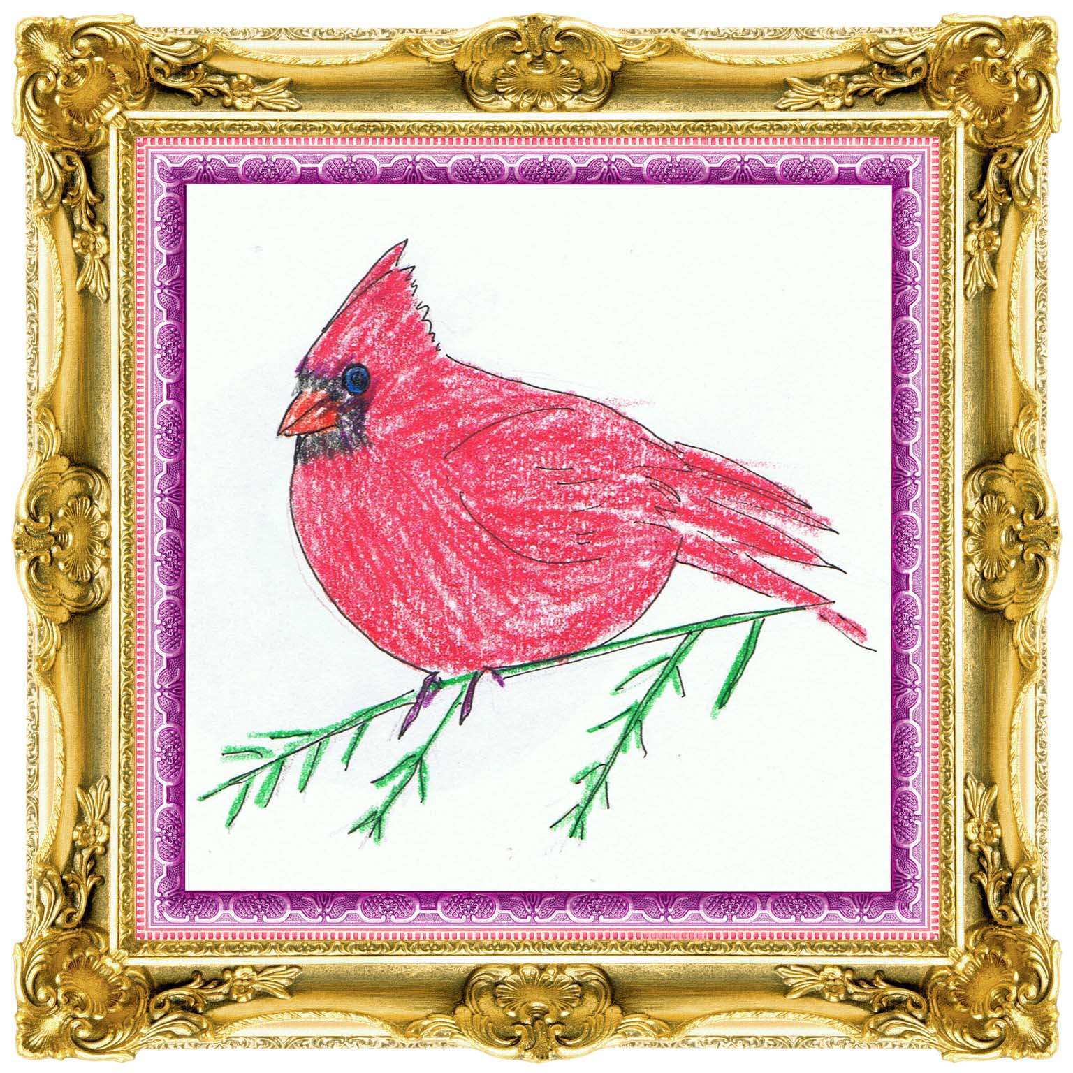 Ok, here is a drawing of a proportionally challenged cardinal. I used an elaborate frame to try to enhance his looks: