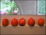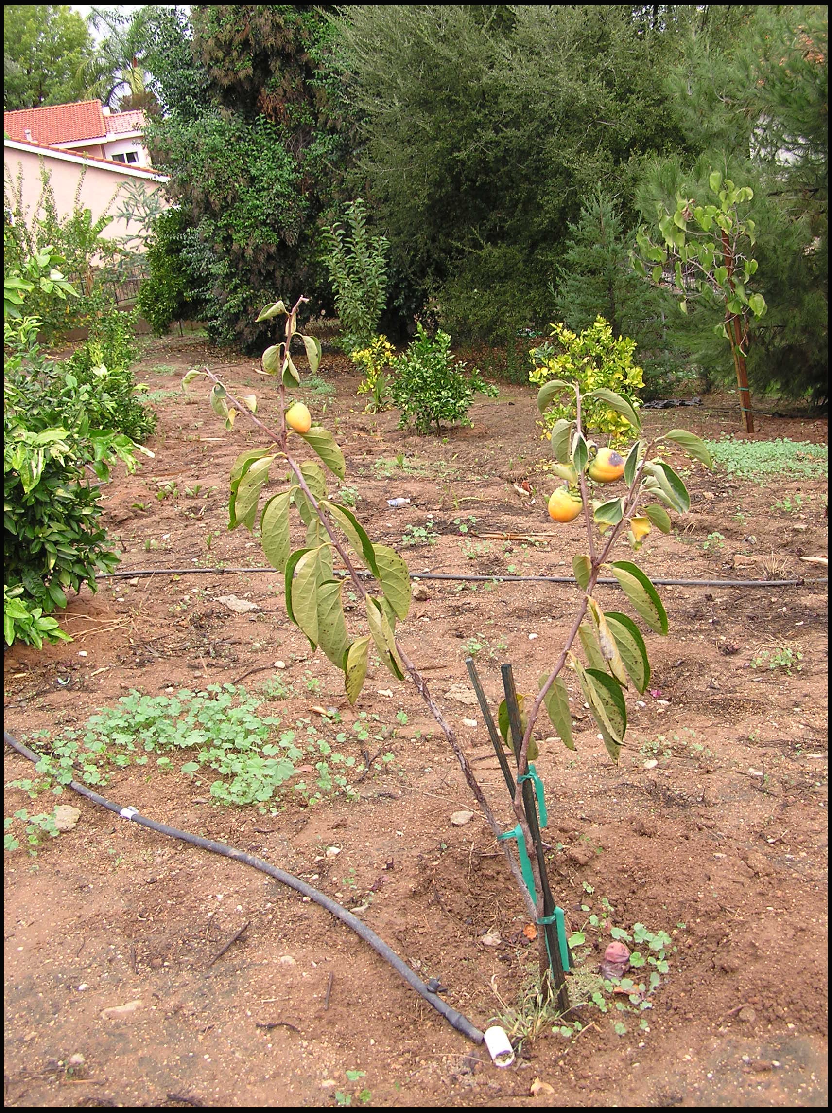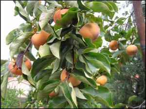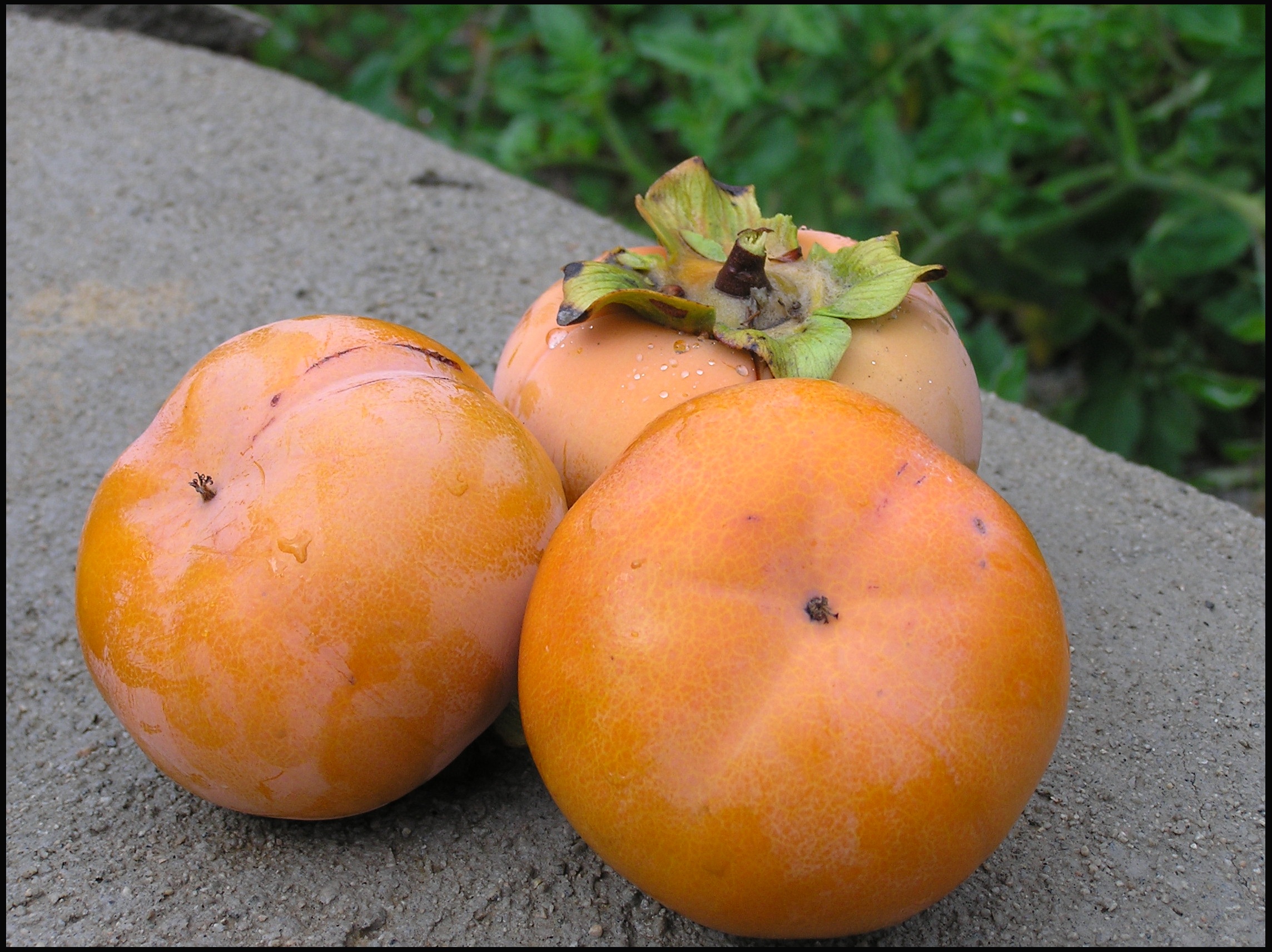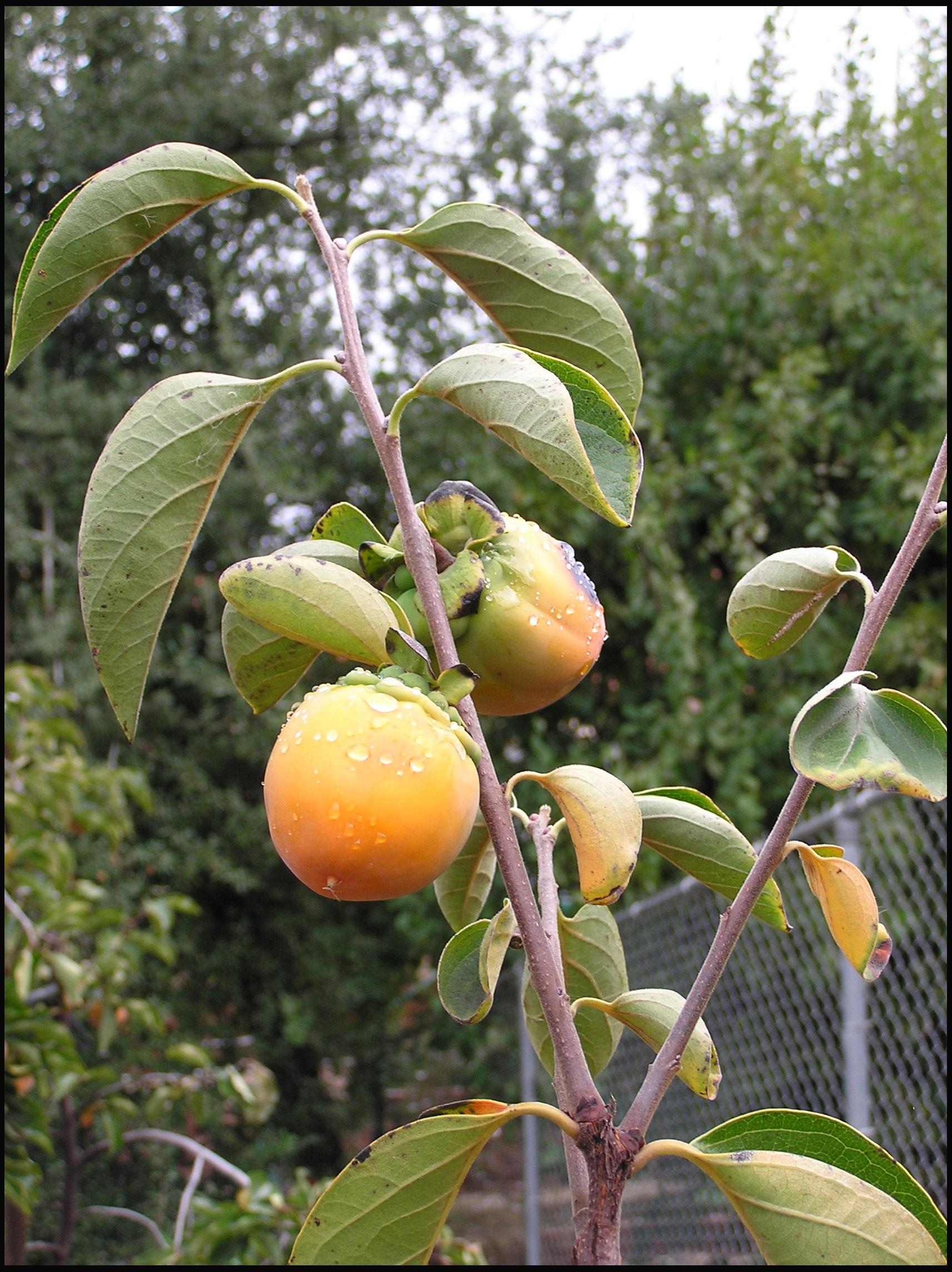 So far, the window sill method is the most ineffective, but that may be since I have a patio overhang that limits direct sunlight. The banana method seems to be working. I am waiting on the vodka bunch. What will I do if/when they all ripen at the same time? I found a recipe for persimmon pudding I am itching to try. I can always freeze them too. Here are some photos from my young back grove. I have a fuyu and a hachiya tree. I planted them about five years ago, but the hachiya had a setback. I thought I lost it after the second year, but two little sprouts grew, and this year, it even bore fruit – three to be exact :-):